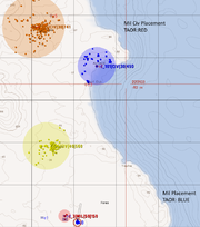 A good tip is to turn Debug on each Placement module and preview the mission to check that the TAORs have at least one objective showing up correctly. The labels indicate the Type of objective (Civ or Mil), the Size and the Priority, which are used by OPCOM's tactical decision making process. When making large or complex missions, it's also useful to take a screenshot of this preview for easy reference later.