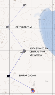 In ALiVE, TAOR markers can be placed on the map to include a number of tactical objectives, which are used by the Placement modules for placing (spawning) units, by the Military AI Commander (OPCOM) for attacking and defending and by Military Logistics (LOGCOM) for delivering battle casualty replacements. Placement modules and the Military AI Commander can have more than one TAOR and they do not have to be the same, so it is possible to create very flexible scenarios.